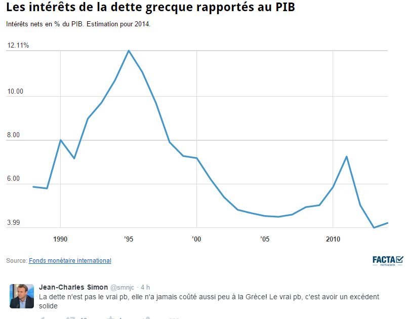 Pour la question des intérêts, il serait bien d’avoir aussi l’évolution des montants de remboursement annuel de capital rapporté au PIB de la Grèce (et à comparer avec les autres pays si c’est pertinent) pour s’apercevoir que si on diminue les frais financiers c’est aussi pour allonger la durée de la dette ou augmenter le remboursement en capital (ou les deux…). Bref, avoir des frais financiers qui diminue n’est pas forcément la panacée !